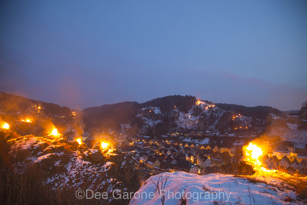 Children dressed up as old men and go from house to house collecting candy, we drank beer and froze our butts off standing on the top of a mountain. The tradition seems to have started because it was the end of the Christmas season, the christmas trees would be chopped up and a community would burn all of the wood. Pottenstein puts on a huge show out of it now-a-days and lights piles of wood all over the two mountains surrounding the valley city.